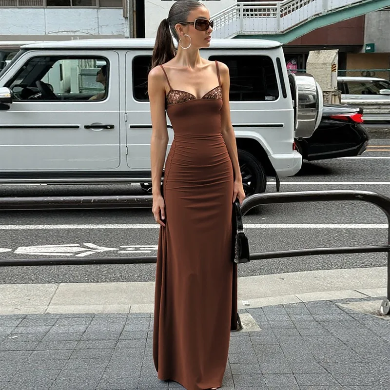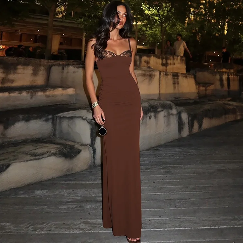 Party Dresses Women V Neck Strap Maxi Dress Brown Sexy Bodycon Dress Ladies